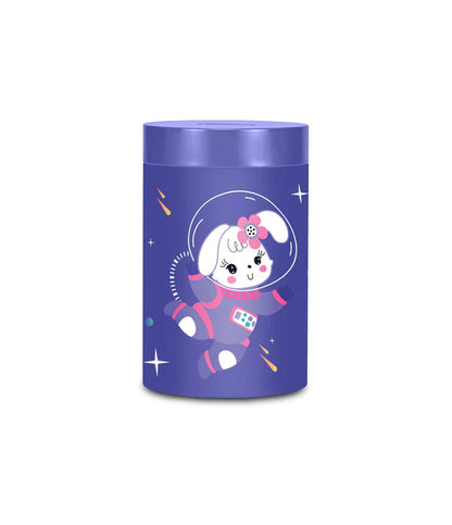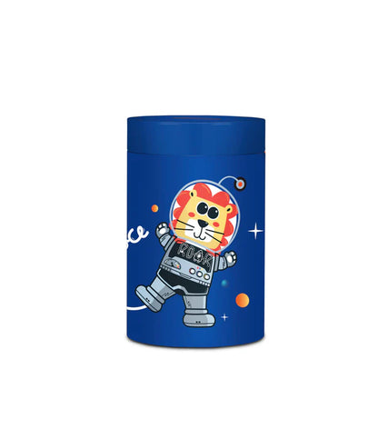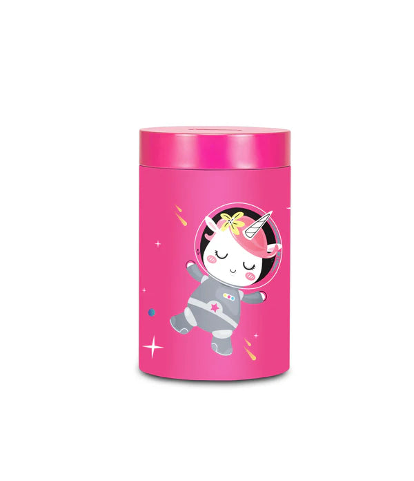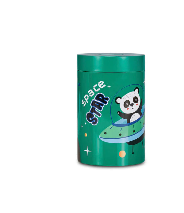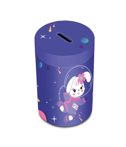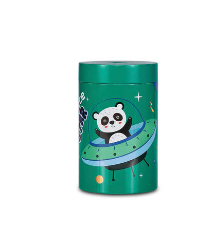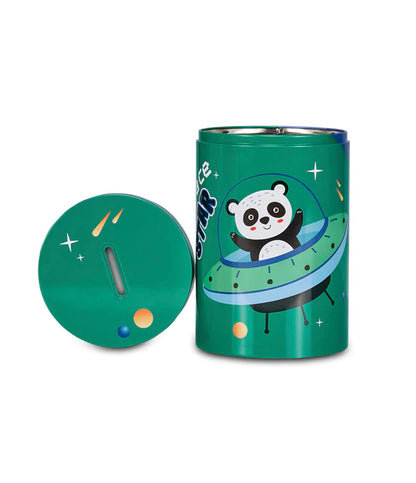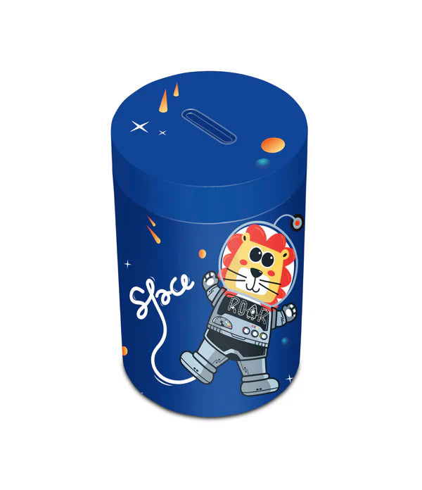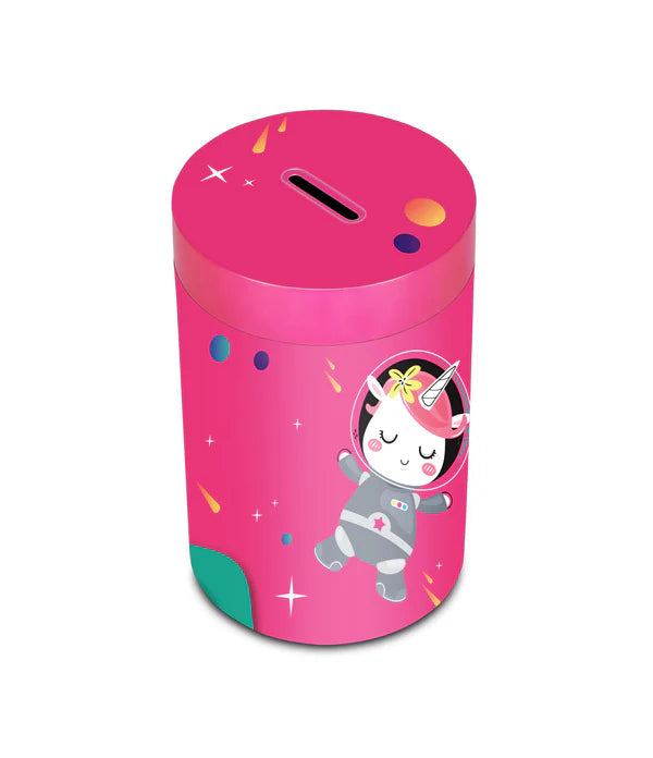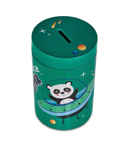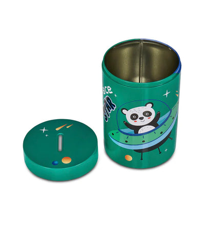 Salvadanaio in latta, leggero e resistente, per iniziare i più piccoli al risparmio. Rimuovendo il coperchio superiore può essere utilizzato anche come portamatite.