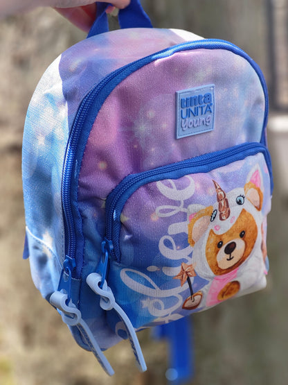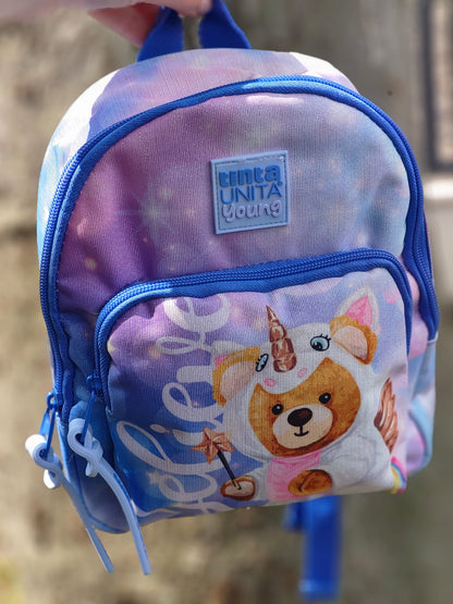 lo zainetto perfetto per il tuo tempo libero con teneri orsacchiotti e una scritta personalizzata: in azzurro 'believe' e in rosa 'angel'